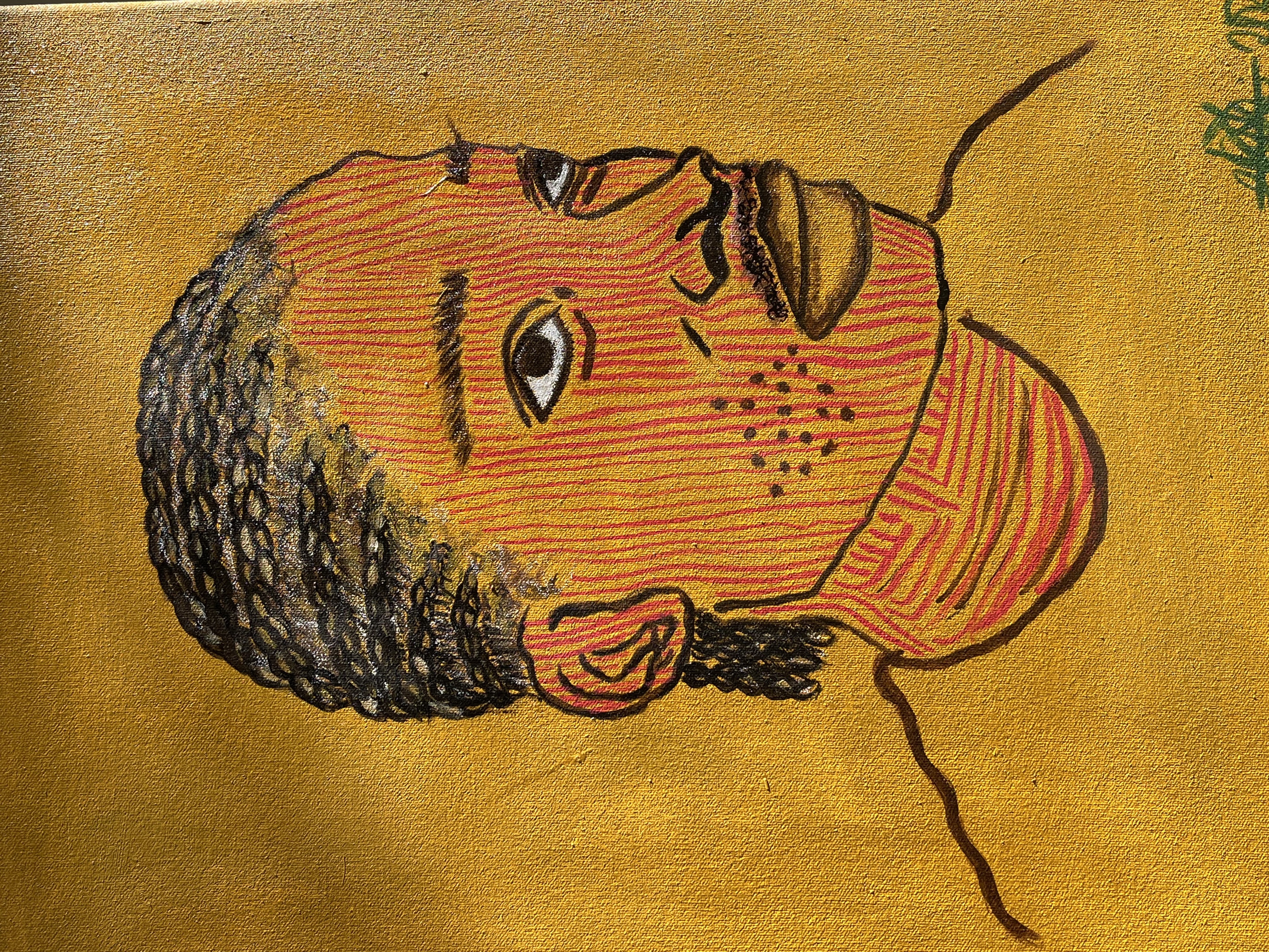 acrylic paint , reused fabric and Sharpie marker on wood panel