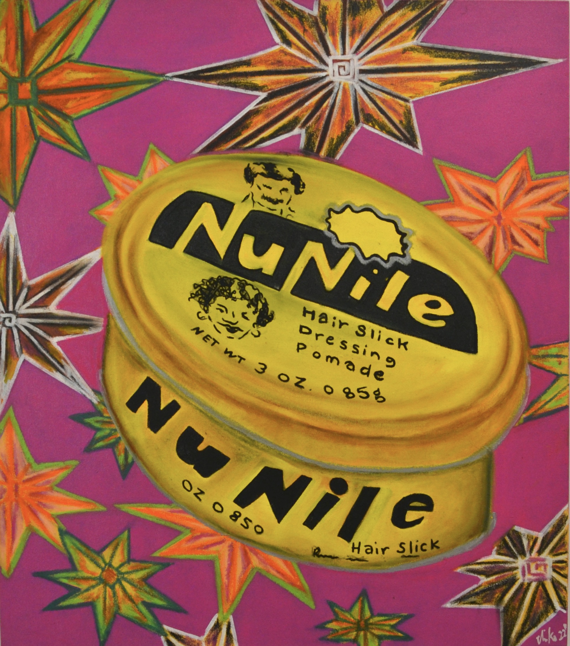 Odeh’s work is inspired by the hand-painted advertisements commonly seen outside hair salons across Africa and the Caribbean, designed to showcase the stylist’s capabilities and attract potential clients. Her fluid brushwork and choice of colours evoke the aging and weathering of these wall ads, capturing the passage of time on the facades of hair salons. The artist’s depictions of hair products also delves into the nefarious aspects of the hair care industry. While the products she chooses to paint might evoke nostalgia and childhood memories for some, they also hint to the harmful ingredients often found in products marketed for Black or natural hair. Beginning in the 1870s, Black people faced societal pressures to chemically alter their hair to align with Eurocentric beauty ideals.